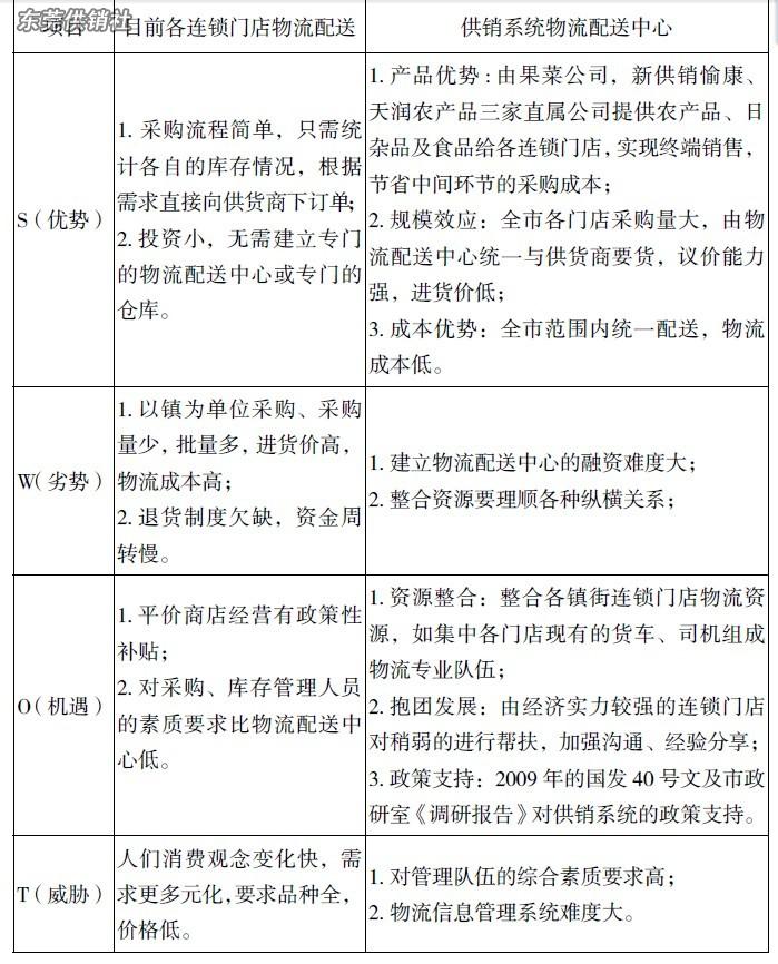 2010 年,全系统实现销售总额47.3 亿元,利润总额7623 万元,经济实力雄厚,拥有35 家自有企业,全市网点达1000 多个,其中,60 多家愉康超市、便利店,40 多家平价商店,连锁门店遍布全市30 多个镇街。连锁企业整合资源后规模变大,采购量惊人,成本将大大降低,因此,建设供销系统物流采购配送中心有很大的必要性。以下是全市供销系统目前的物流现状与设想建设供销系统物流采购配送中心的SWOT 分析,如表所示。全市供销系统连锁门店目前物流现状与设想供销系统